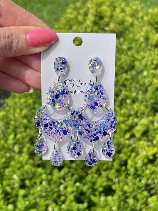 Blue & White Glitter Resin Chandelier Earrings | Lightweight Statement Dangles with Teardrop Accents 1