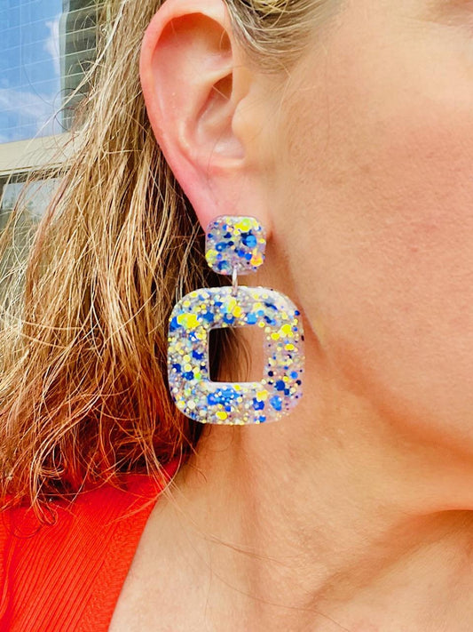 Blue & White Glitter Resin Earrings | Lightweight Square Statement Dangle earrings