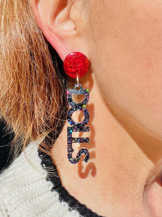 Dolls glitter resin word earrings - Drill team/Dance Team handmade jewelry
