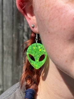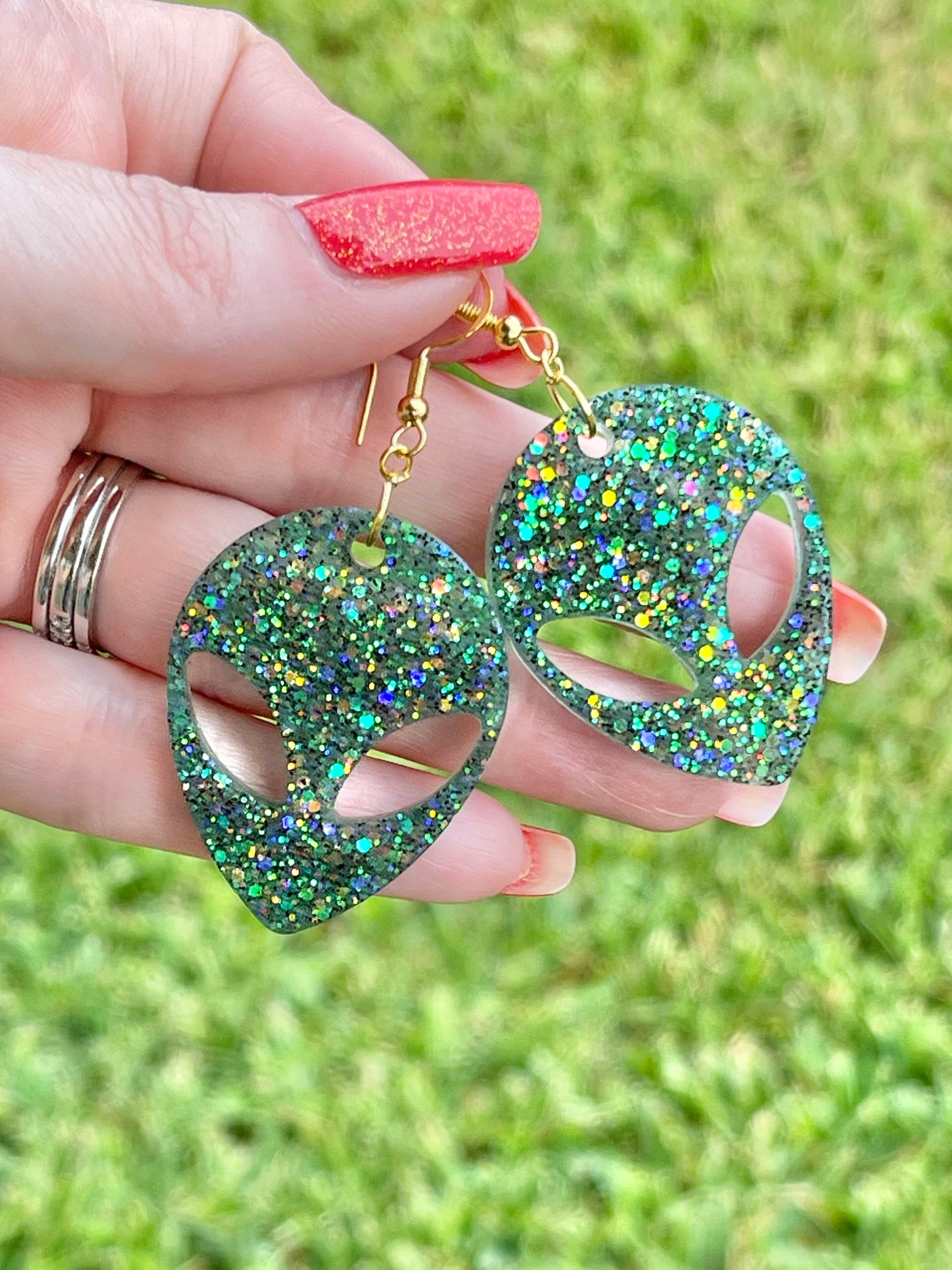 These fun, sparkly, alien earrings are hand-crafted by me from resin. These earrings are very light-weight.