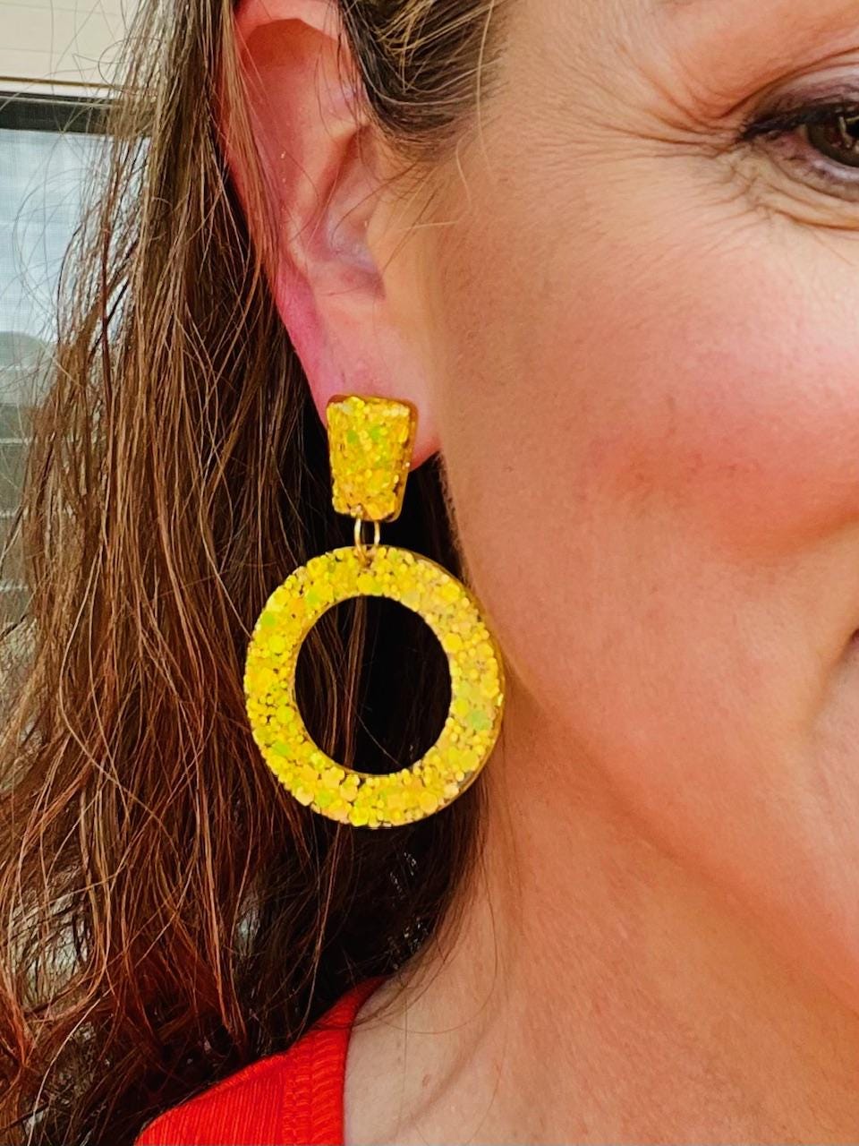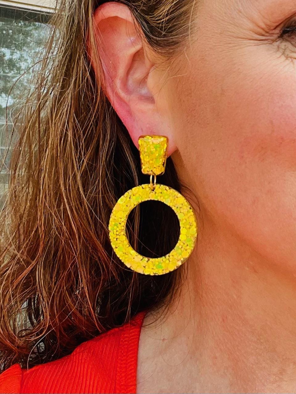 Amalfi Coast Inspired Earrings - Lemon Yellow Glitter Hoop Dangle Earrings