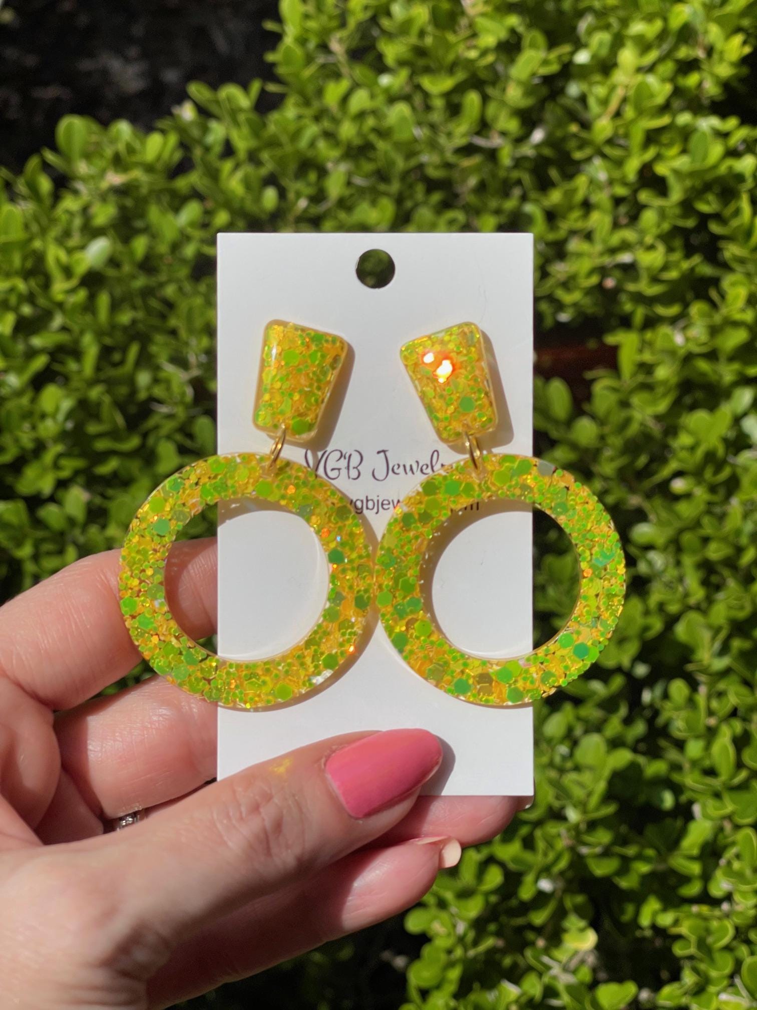 Resin earrings are made with a 2-part resin and glitter or dye, and attached to stainless steel, hypoallergenic posts and hooks.