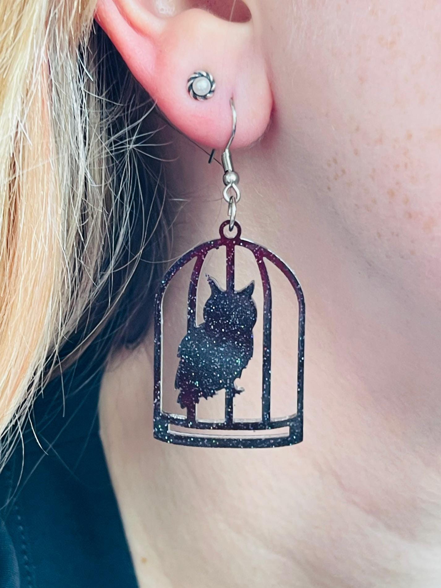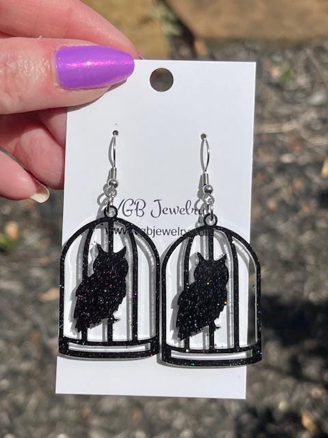 Black Owl Birdcage Earrings – Glitter Resin Halloween Jewelry – Spooky Owl Lover Gift – Lightweight Dangle Earrings