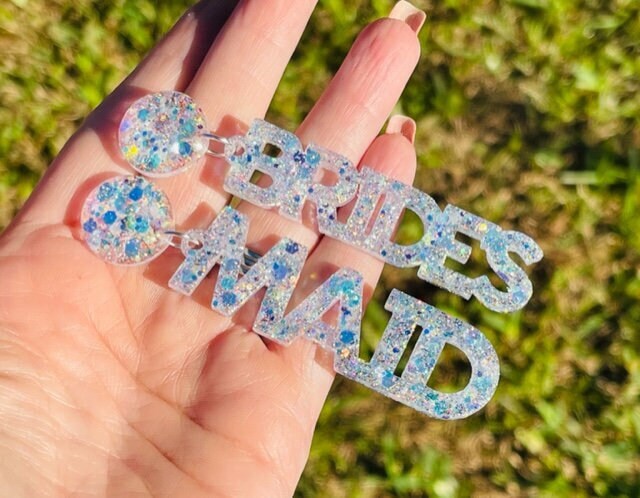 Celebrate your role in the wedding with these dazzling Bridesmaid earrings! Made with high-quality resin and sparkling glitter, these earrings spell out "Brides/maid" in a chic, bold font. They add a fun and eye-catching touch to all your bridal showers, bachelorette parties, and other pre-wedding festivities.