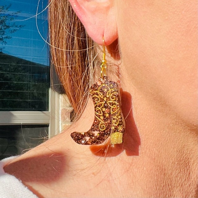 These beautiful sparkly earrings are hand-crafted by me from resin. These earrings are very light-weight. The stitching is highlighted with gold mica powder...Great for showing that rodeo spirit!