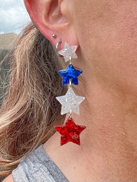 Check out these fabulous dangling graduated stars earrings, made from resin and glitter in red, white, and blue! Perfect for showing off your patriotic spirit or adding a fun, colorful touch to any outfit, these earrings feature a trio of stars that cascade down in a playful, eye-catching design. Each star sparkles with glitter, creating a vibrant and festive look. Whether you're celebrating a holiday, attending a special event, or just feeling star-spangled stylish, these earrings are a must-have accessory. Shine on, star!