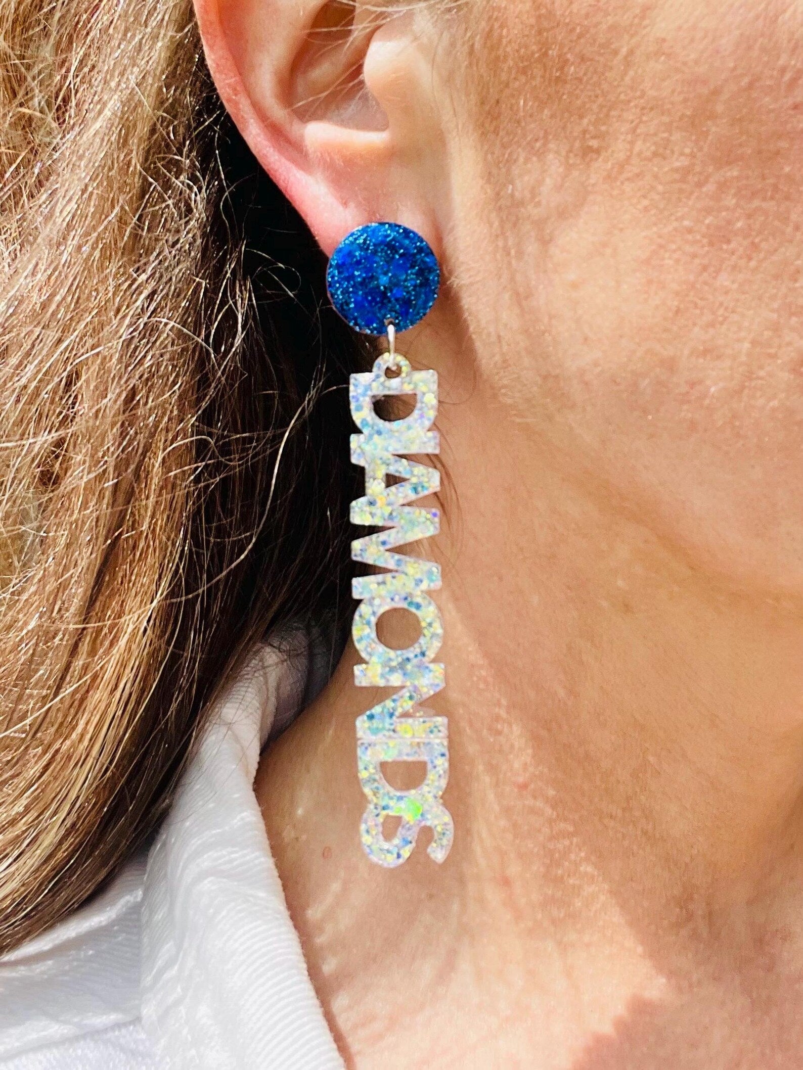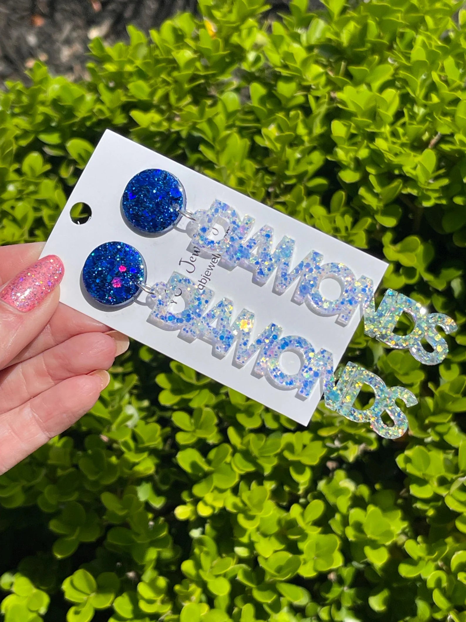 Introducing these stunning glitter & resin earrings that spell out "Diamonds"! Perfect for cheering on your Dickinson or Pearland Dawson High School drill team dancer, or any team with the Diamonds name. Each letter glimmers with glitter, encased in sleek resin, making them both stylish and sturdy. Whether you're at a performance, a game, or just showing your support around town, these earrings add a fabulous and spirited touch to any outfit. Shine bright with Diamonds pride!