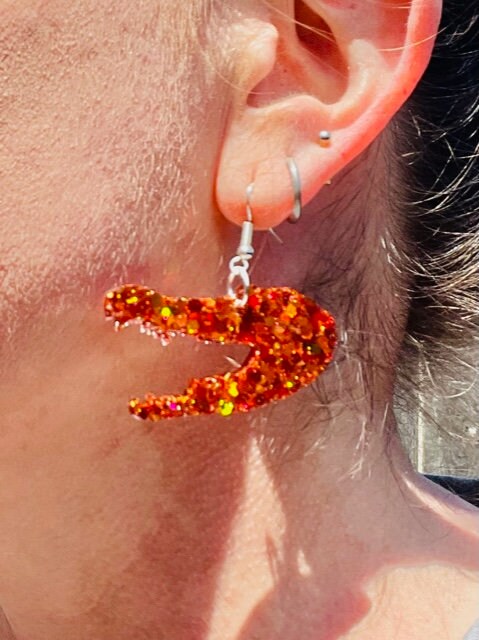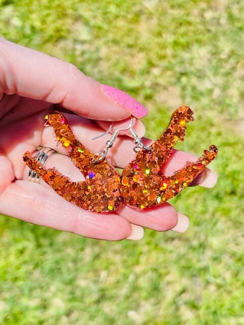 Resin earrings are made with a 2-part resin and glitter or dye, and attached to stainless steel, hypoallergenic posts and hooks.