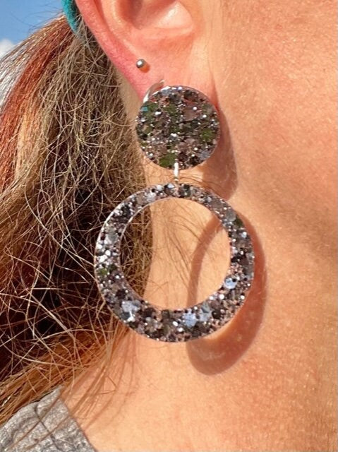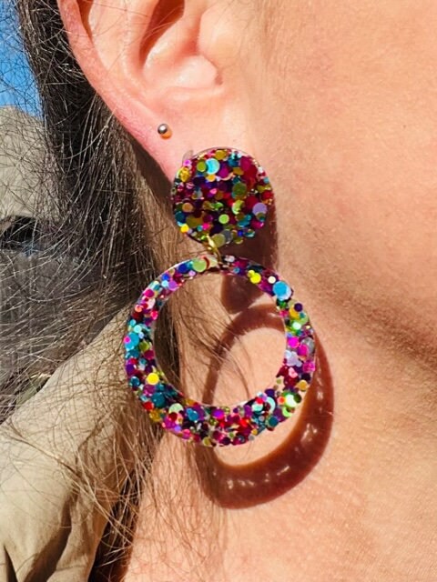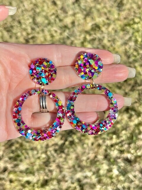 Resin earrings are made with a 2-part resin and glitter or dye, and attached to stainless steel, hypoallergenic posts and hooks.
