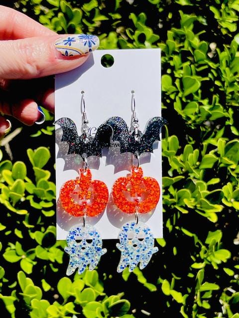 Get in the spooky spirit with these glittery Halloween dangle earrings featuring black bats, sparkling orange pumpkins, and shimmering blue ghosts. Made from lightweight resin, they’re perfect for adding a playful pop to your costume, trick-or-treat outfit, or October everyday style. Comfortable to wear and sure to get compliments at every haunted happening!