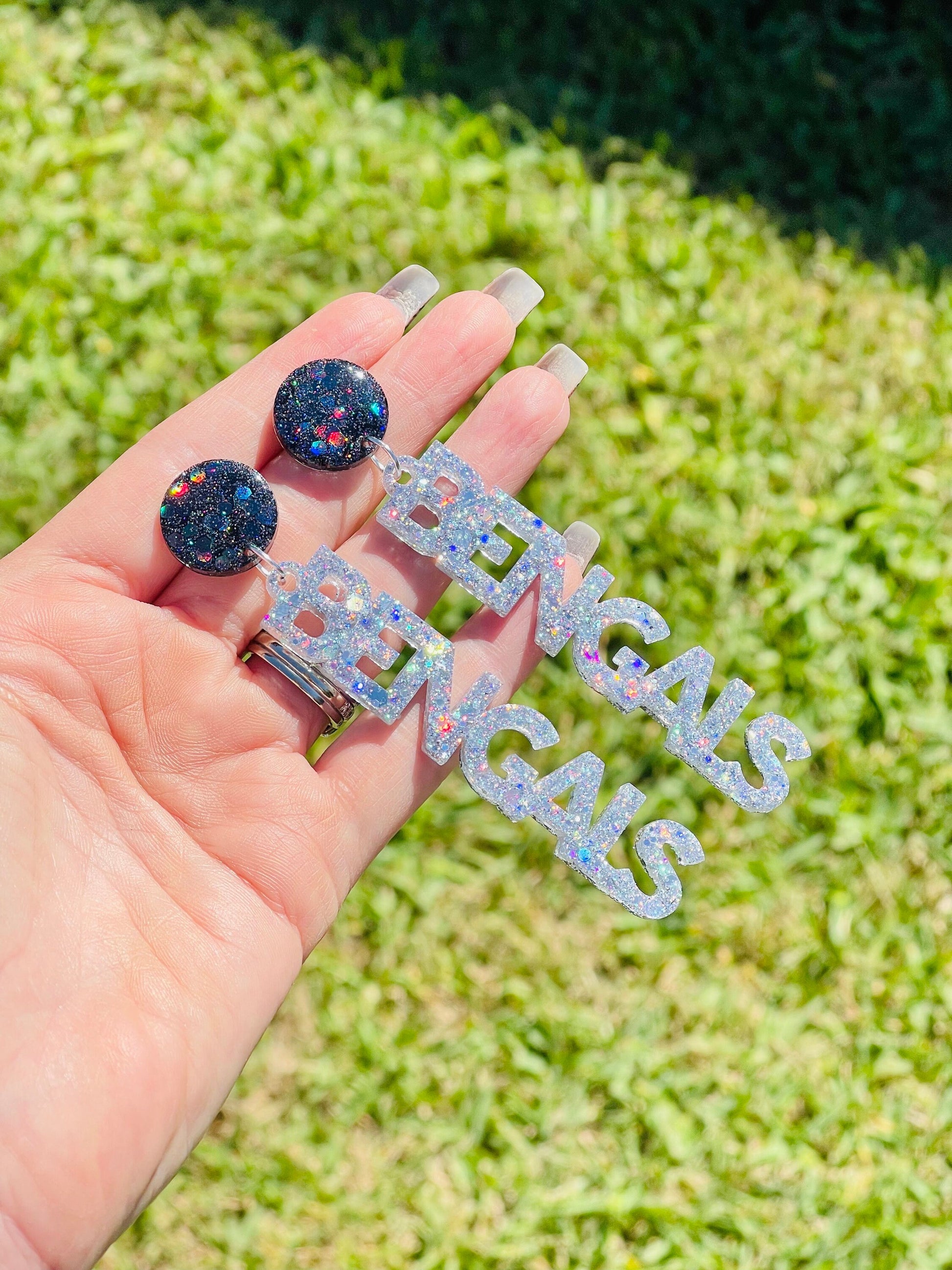 Show off your team spirit with these dazzling Bengals earrings! Made with high-quality resin and packed with shimmering glitter, these earrings spell out "Bengals" in bold, eye-catching letters. Perfect for any team sporting the name, these earrings add a fun and sparkly touch to your game day look.