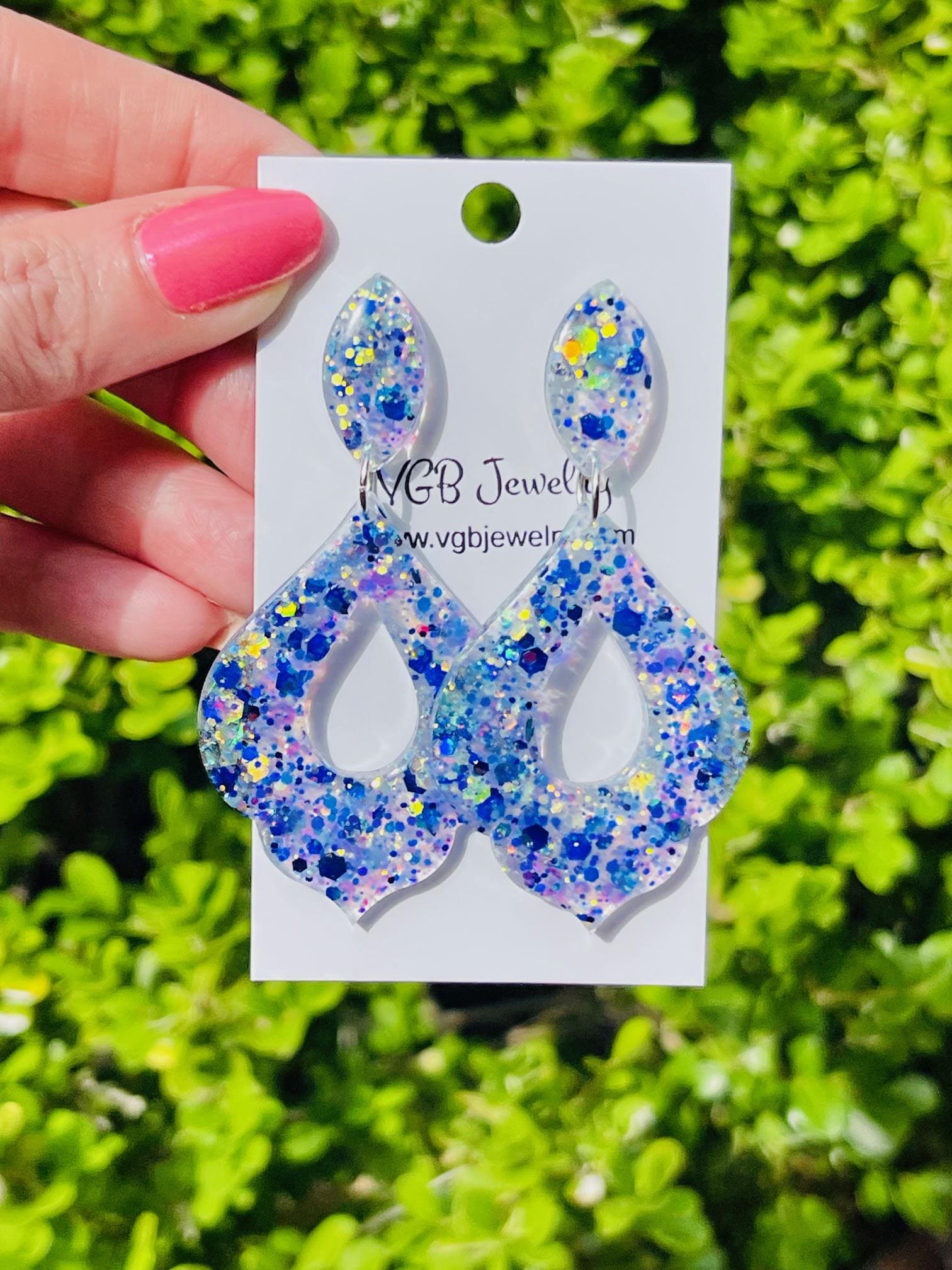 Make a statement that shimmers with every step! These handcrafted resin earrings feature a dreamy blend of unique glitter mixes for each season...the blue gives off serious ocean breeze and summer night vibes, while the red/orange and brown/green mixes are great for cozy fall fun. Designed with a unique decorative shape, they’re lightweight, bold, and ready to turn heads.