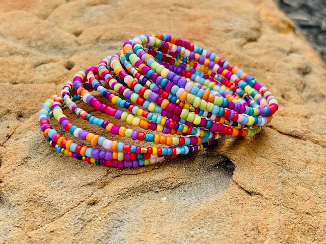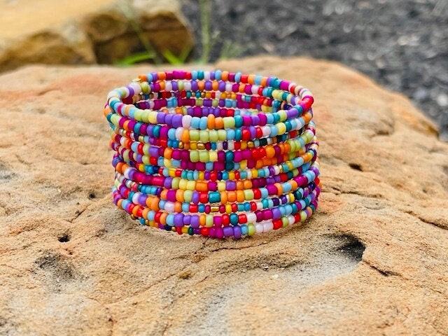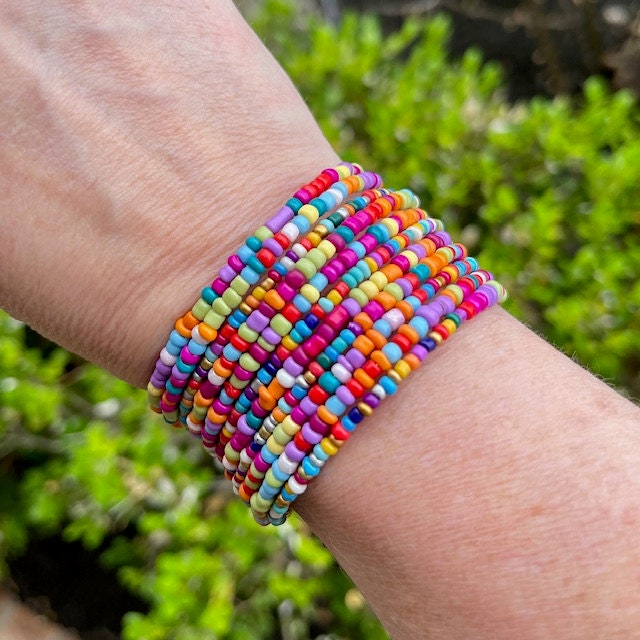 Super versatile wrap bracelet made with 11 rows beautiful, brightly colored glass seed beads. It's got a very cheery feel, and makes a fun addition to any outfit! With memory wire, there's no worry about losing one of the bracelets in the stack, because it's all one piece! Fits wrists sizes 5"-7" (7" will fit snugly).