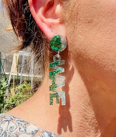 Resin earrings are made with a 2-part resin and glitter or dye, and attached to stainless steel, hypoallergenic posts and hooks.