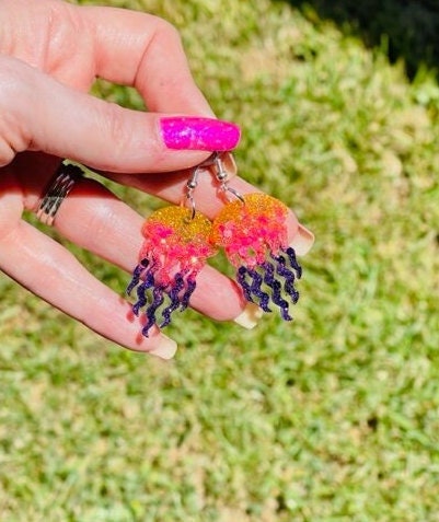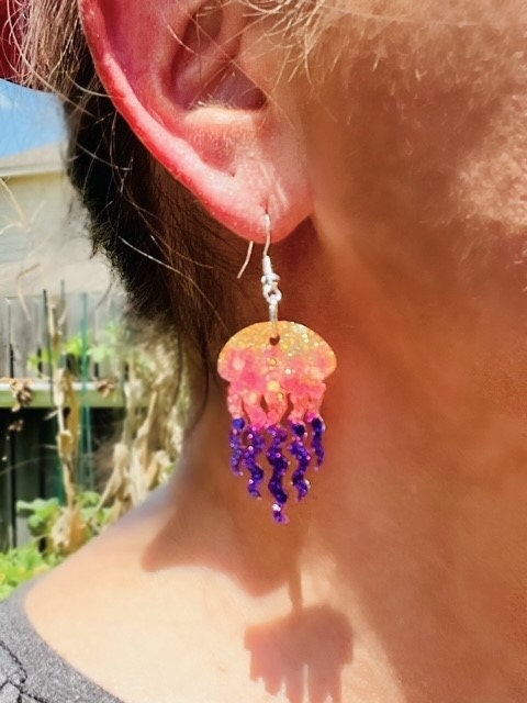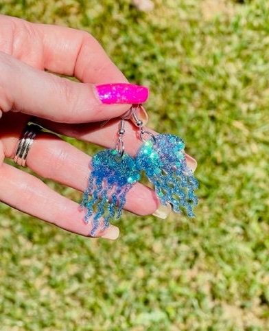 Resin earrings are made with a 2-part resin and glitter or dye, and attached to stainless steel, hypoallergenic posts and hooks.