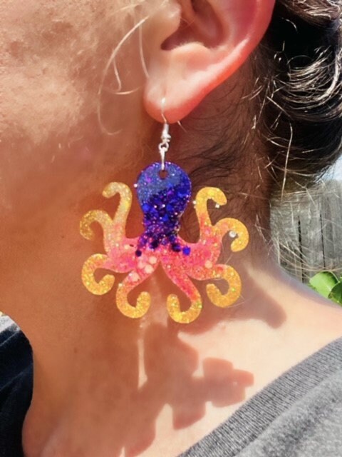 Resin earrings are made with a 2-part resin and glitter or dye, and attached to stainless steel, hypoallergenic posts and hooks.