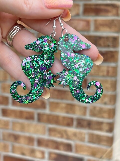 Resin earrings are made with a 2-part resin and glitter or dye, and attached to stainless steel, hypoallergenic posts and hooks.