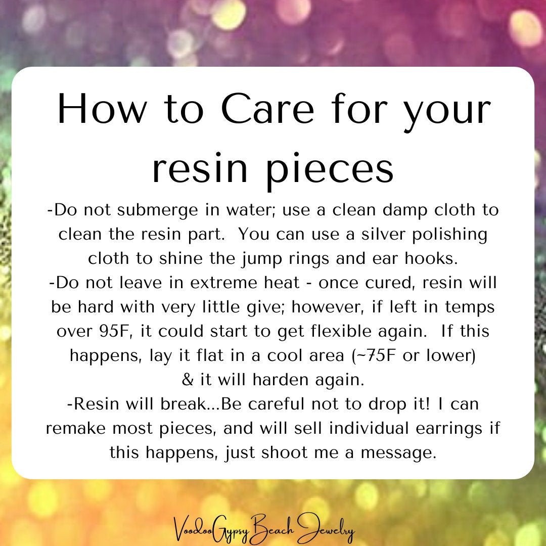 Heat Sensitivity: Do not leave your resin jewelry in hot environments. Excessive heat can cause the resin to become flexible. If this occurs, lay the earrings flat in a cool area (approximately 70 degrees Fahrenheit, not in the refrigerator or freezer). They should regain their hardness within a few hours.