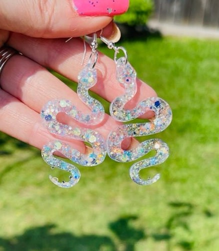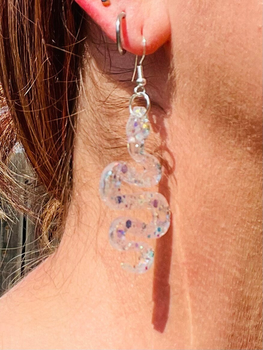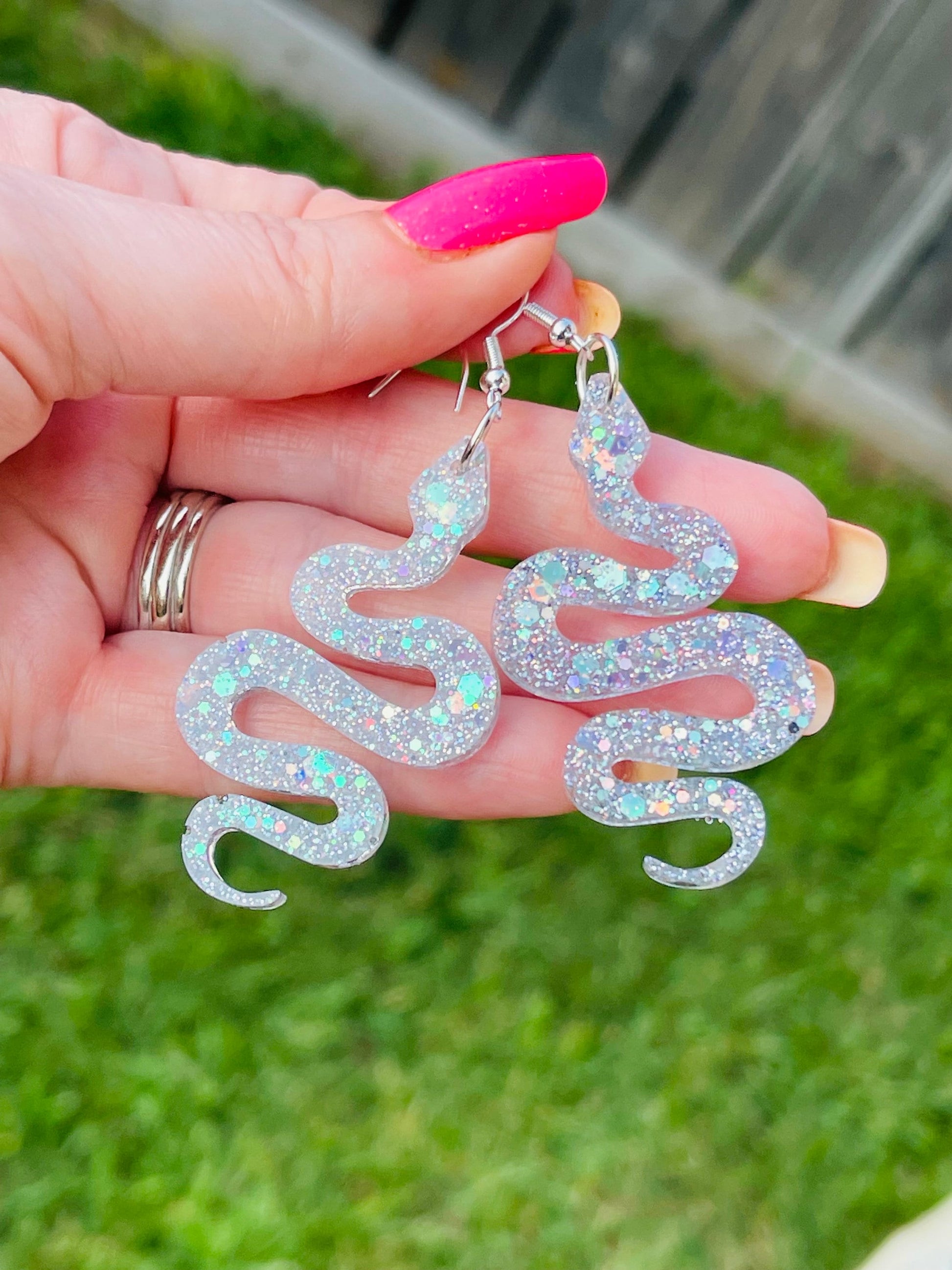 Introducing our stunning slithering snake earrings, the ultimate accessory for your next concert or edgy event! These dazzling beauties are crafted with shimmering glitter and smooth resin, capturing the essence of a snake's sinuous elegance. Their eye-catching sparkle and bold design are sure to turn heads and add a touch of daring glamour to any outfit. Whether you're dancing the night away or just want to make a statement, these earrings are the perfect way to showcase your wild side with style.