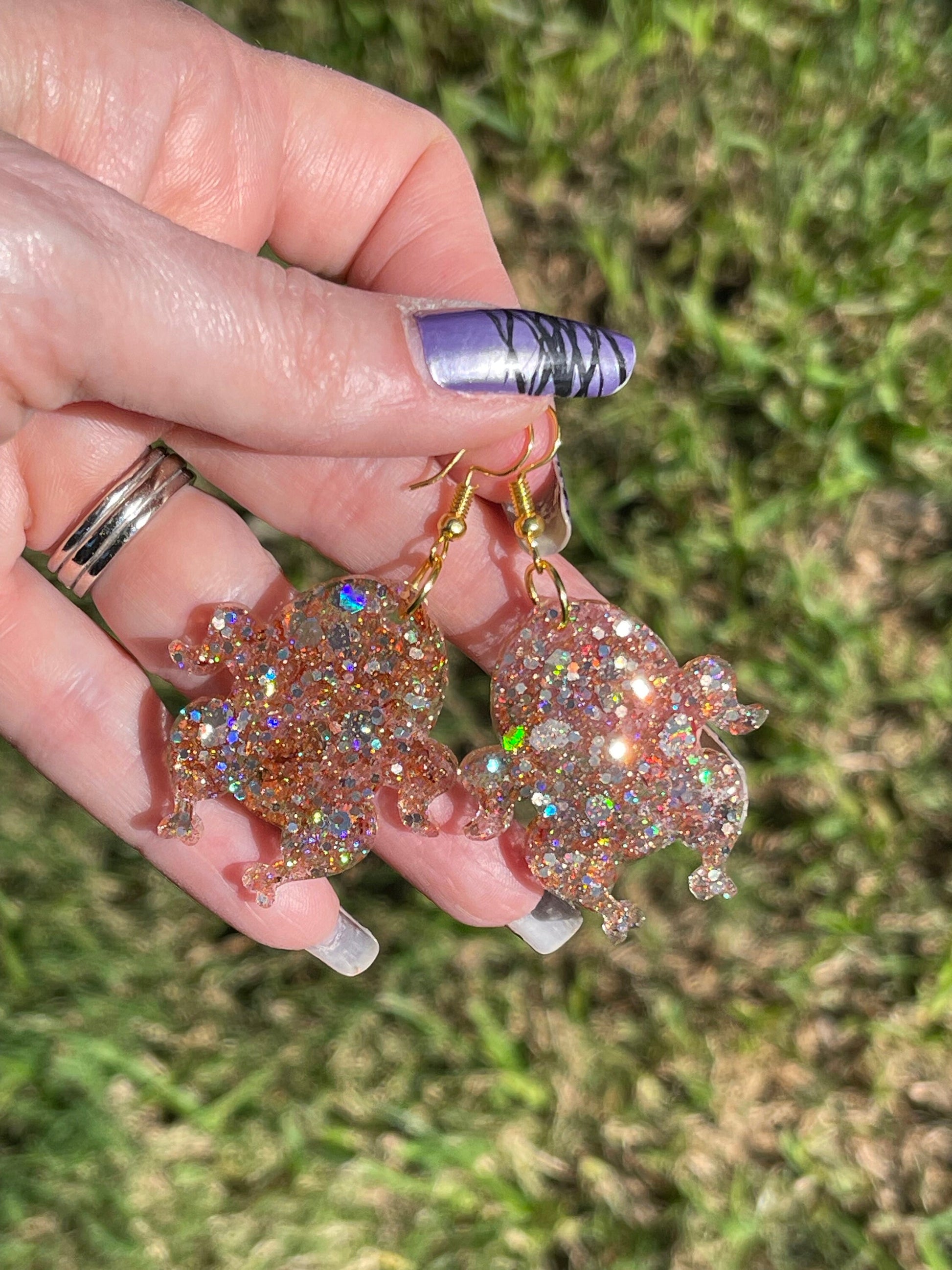 Resin earrings are made with a 2-part resin and glitter or dye, and attached to stainless steel, hypoallergenic posts and hooks.
