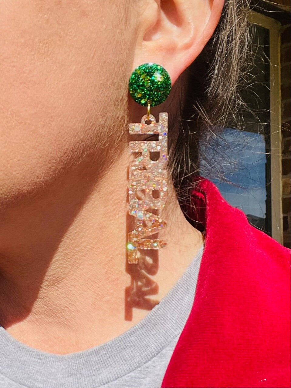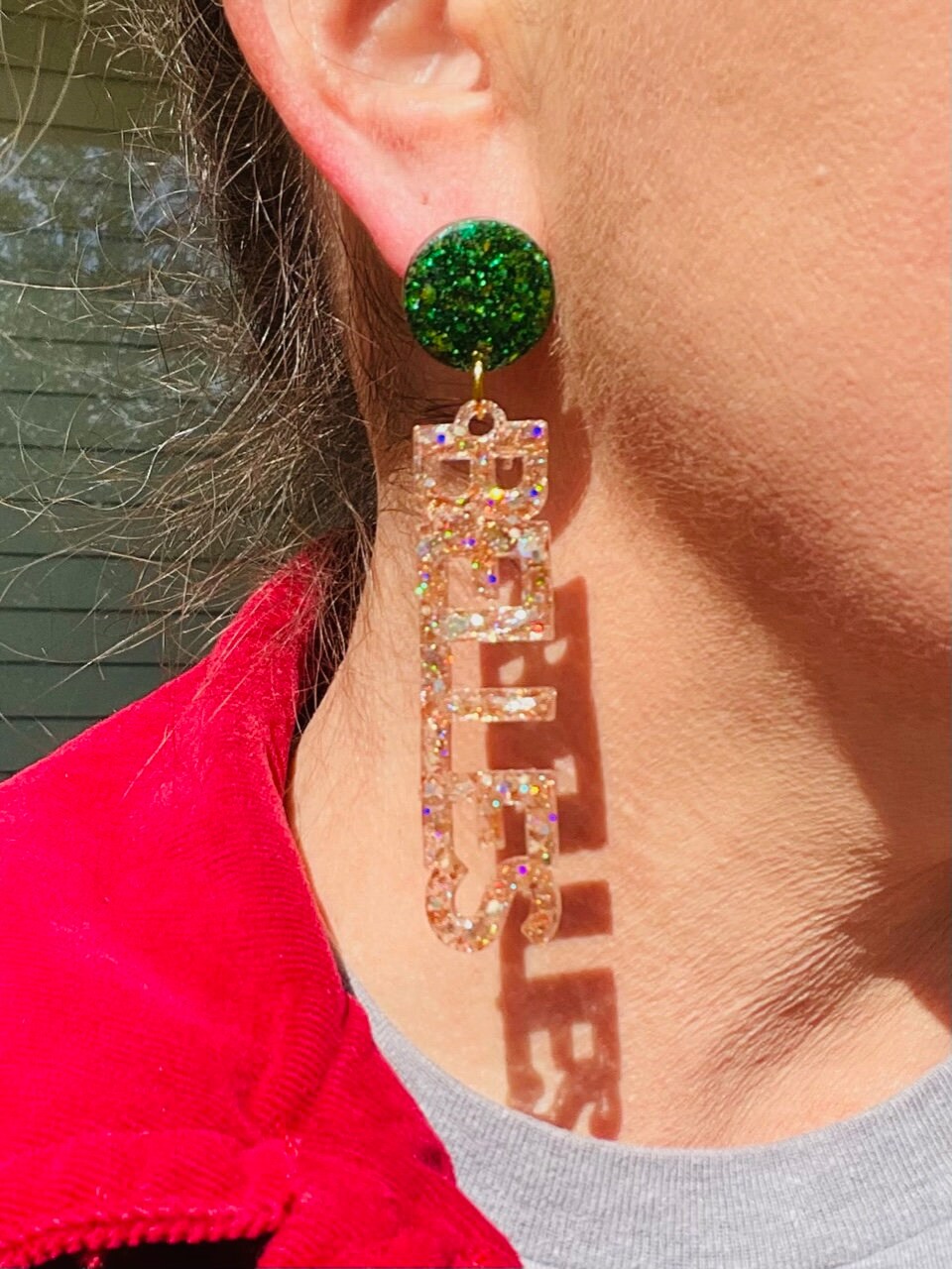 Santa Fe High School Tribal Belles drill team glitter resin word earrings